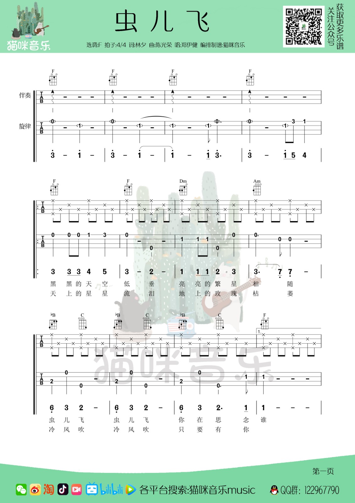 儿歌《虫儿飞》尤克里里谱-F调完整弹唱指弹谱...