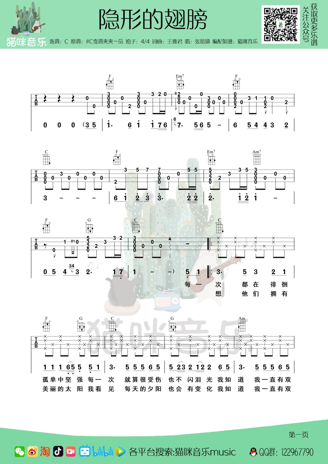 张韶涵《隐形的翅膀》尤克里里谱-C调完整弹唱谱...