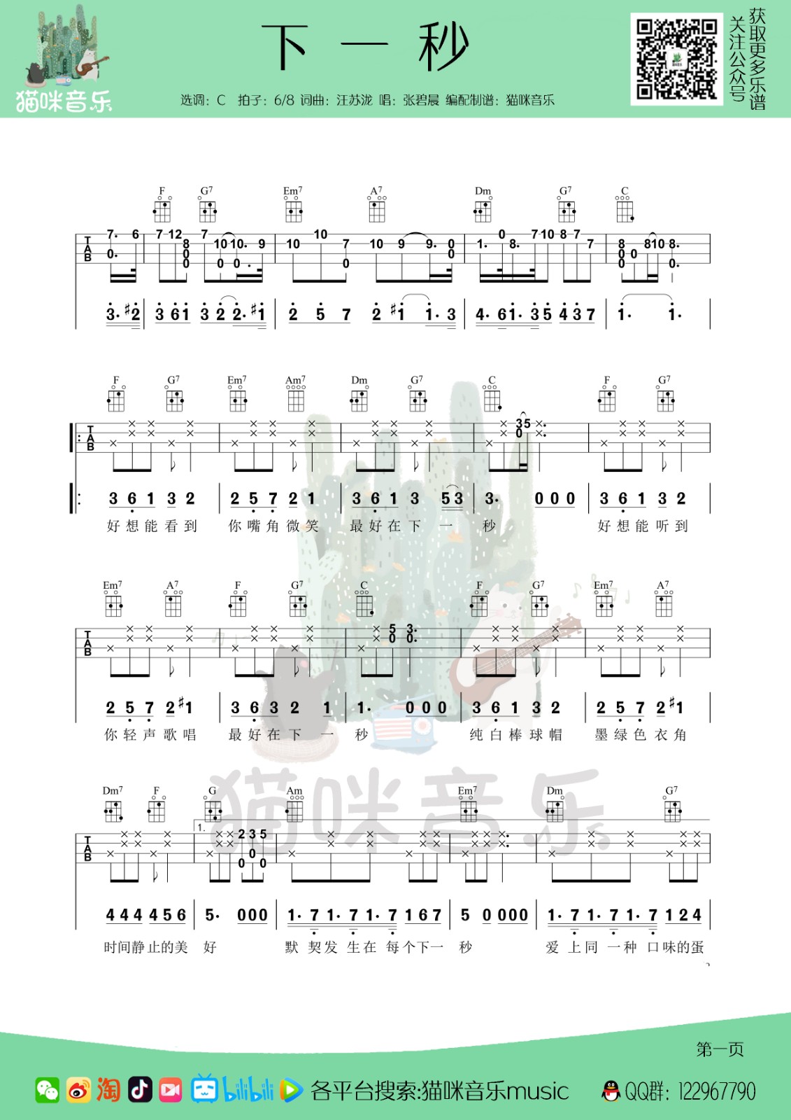 张碧晨《下一秒》尤克里里谱-C调完整弹唱谱...