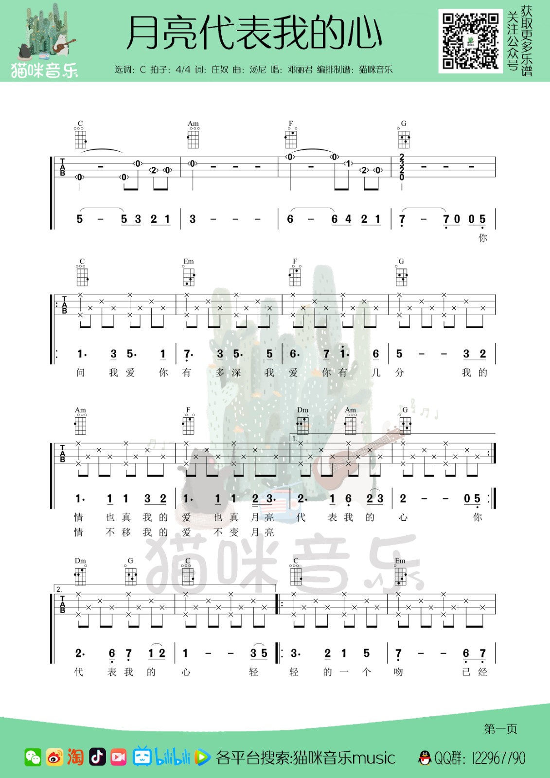 邓丽君《月亮代表我的心》尤克里里谱-C调完整弹唱谱...