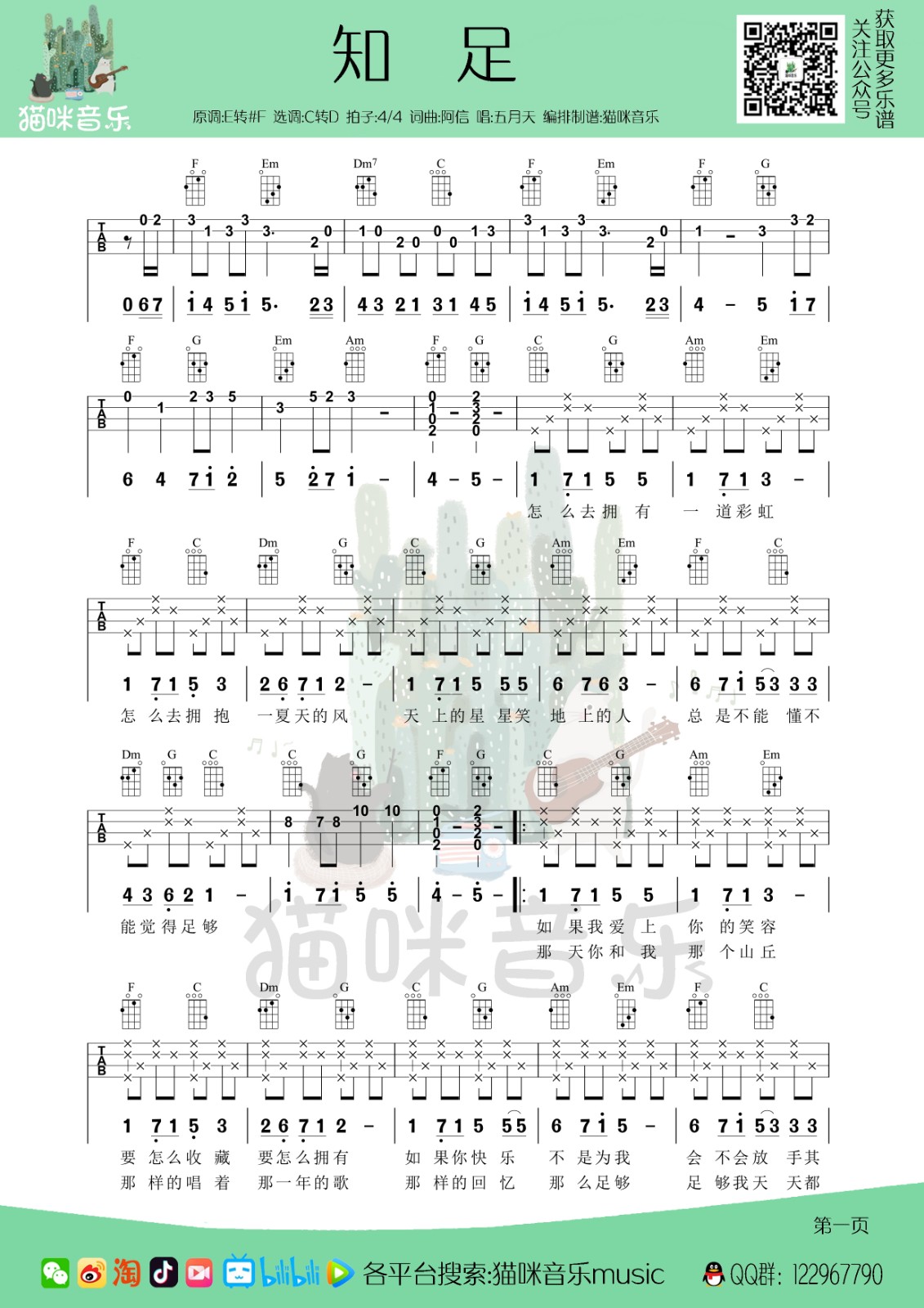 五月天《知足》尤克里里完整弹唱谱-D调弹唱谱...