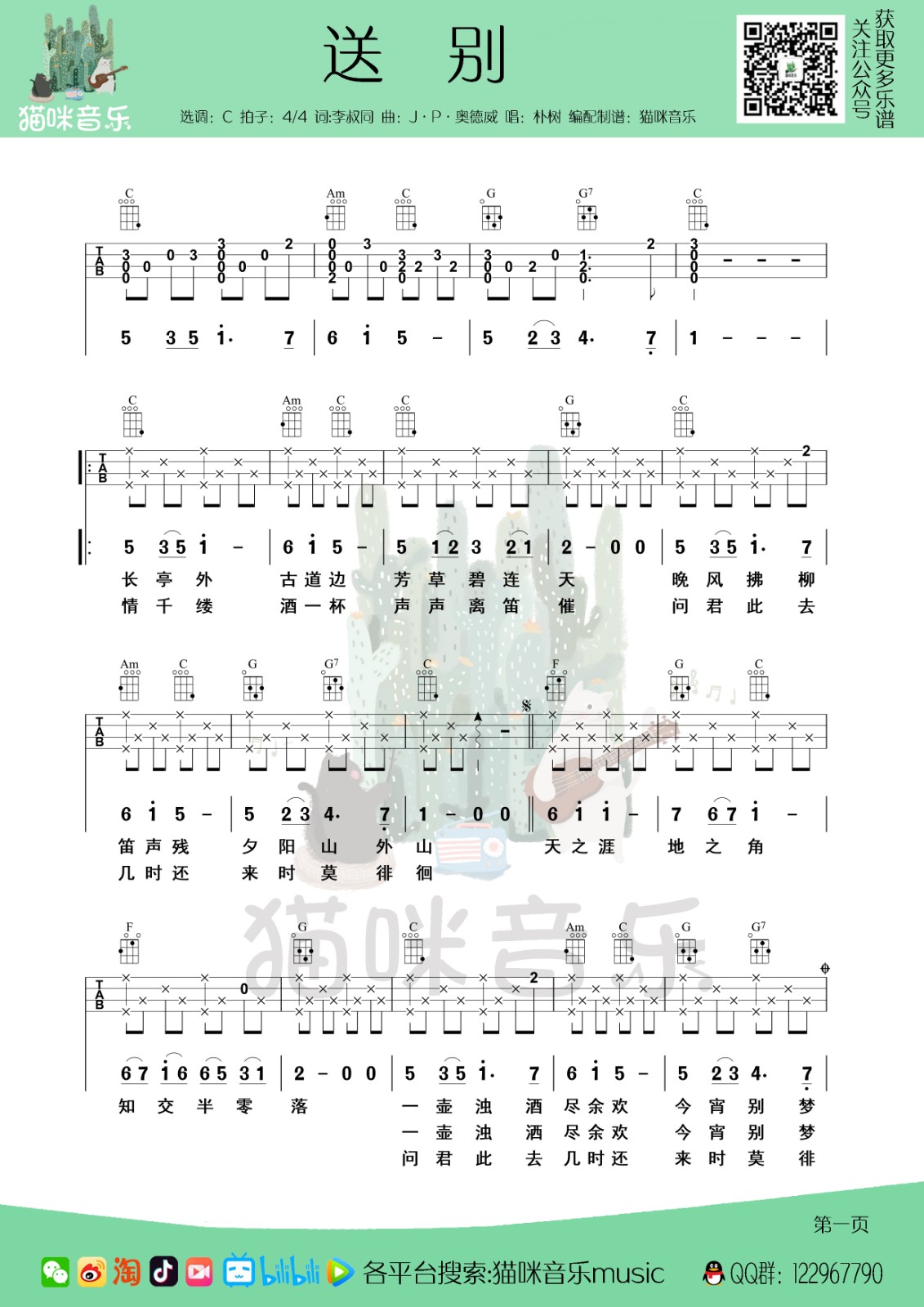 朴树《送别》尤克里里曲谱-C调弹唱谱...