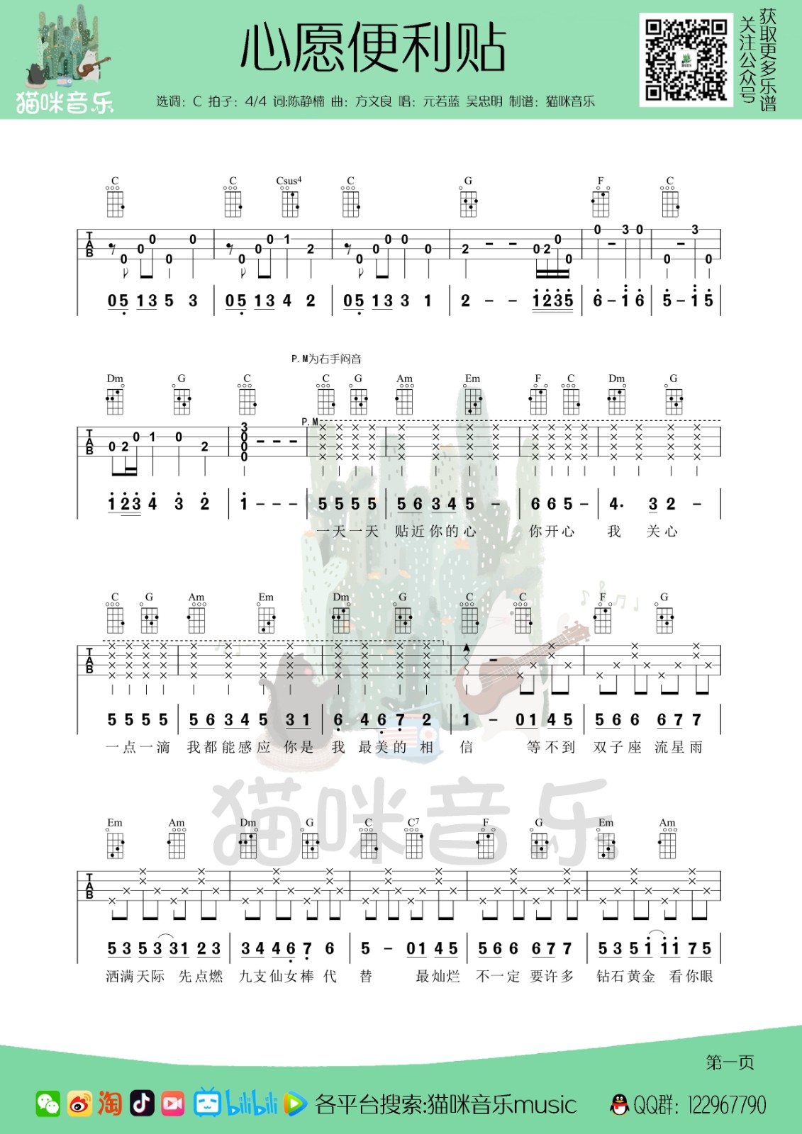 元若蓝/吴忠明《心愿便利贴》尤克里里完整弹唱谱-C调弹唱谱...