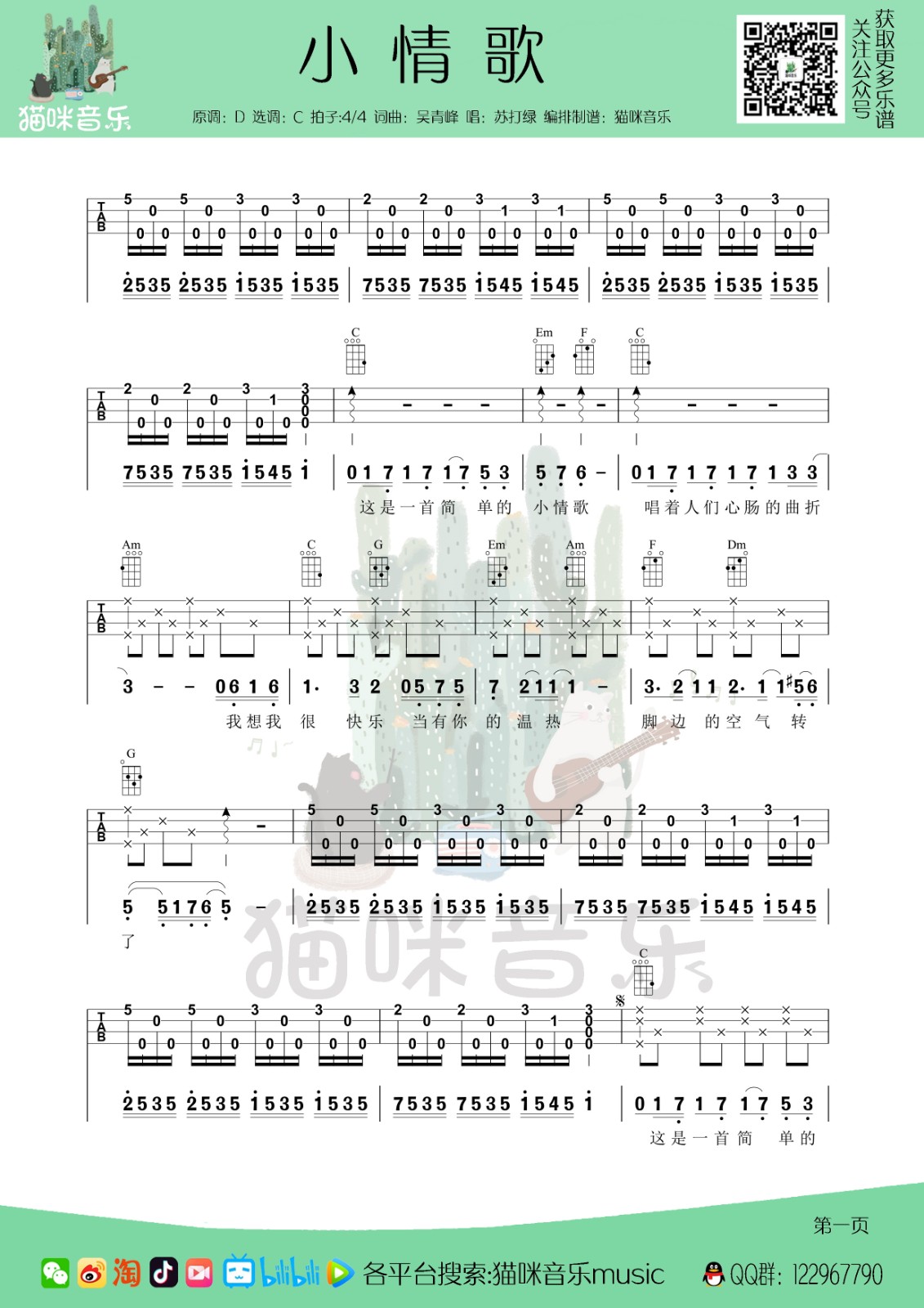 苏打绿《小情歌》尤克里里完整弹唱谱-C调弹唱谱...