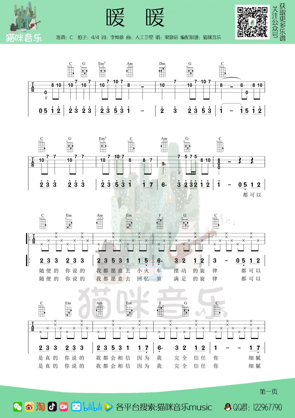尤克里里梁静茹《暖暖》尤克里里完整弹唱谱(四线+简谱旋律)-C调弹唱谱