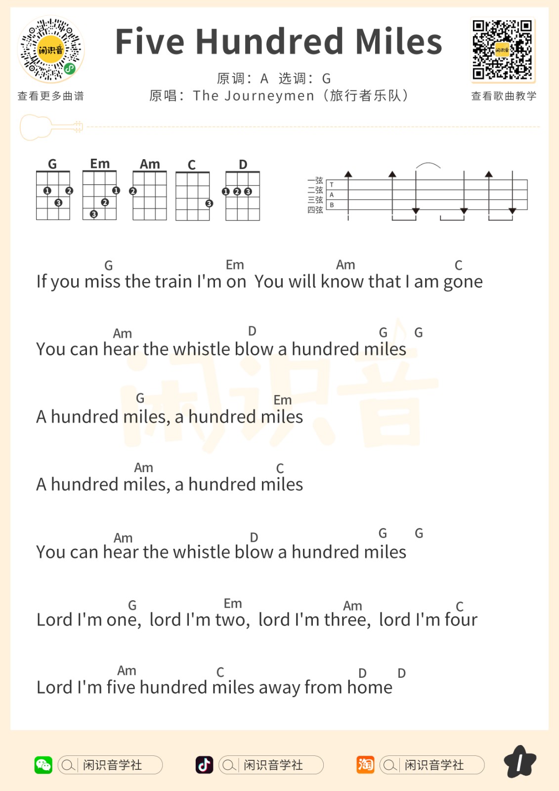 旅行者乐队《FiveHundredMiles》尤克里里曲谱-G调弹唱谱...