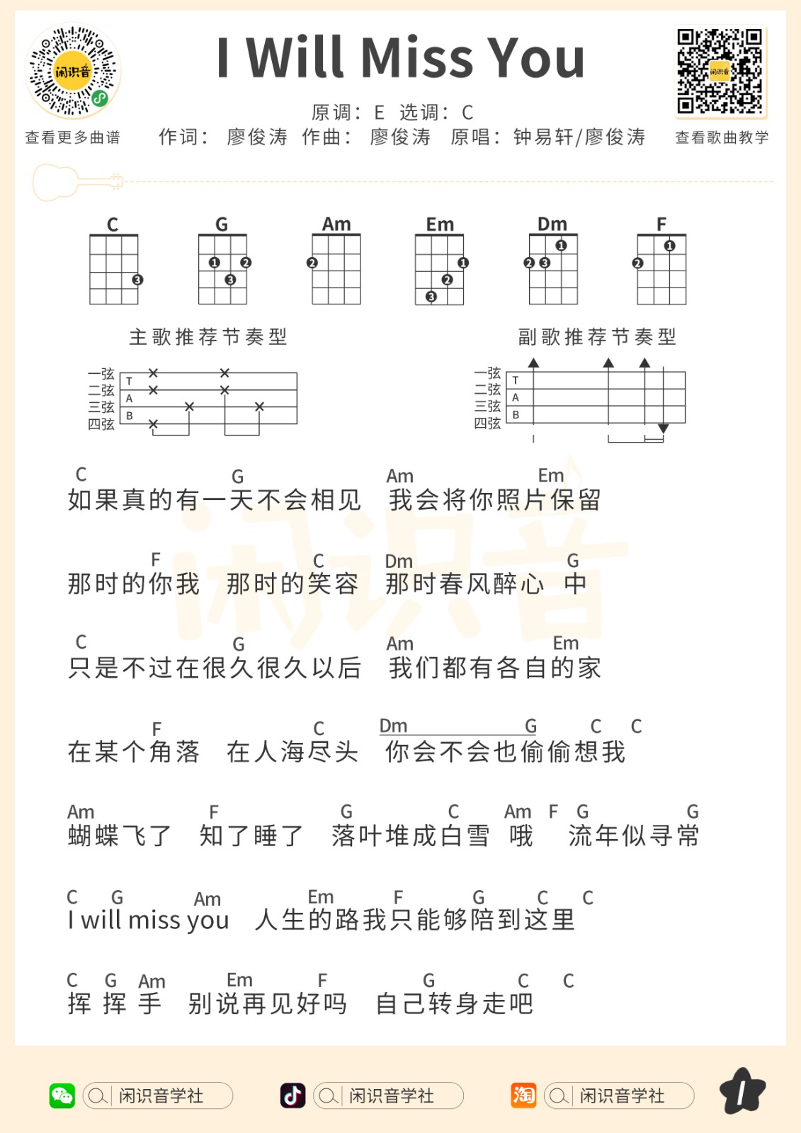 钟易轩/廖峻涛《I-Will-Miss-You》尤克里里曲谱-C调弹唱谱...