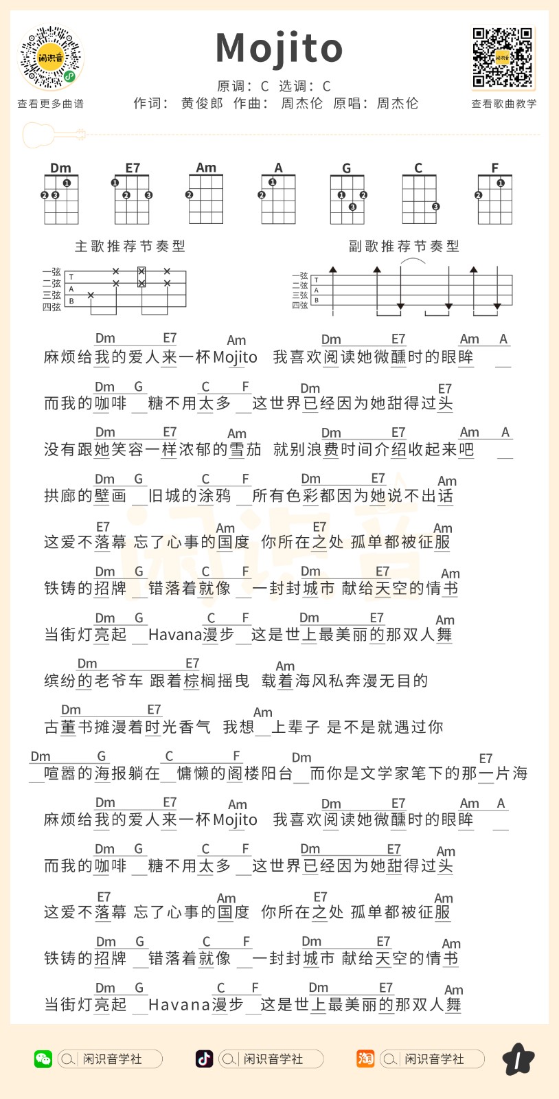 尤克里里周杰伦《Mojito》尤克里里曲谱-C调弹唱谱