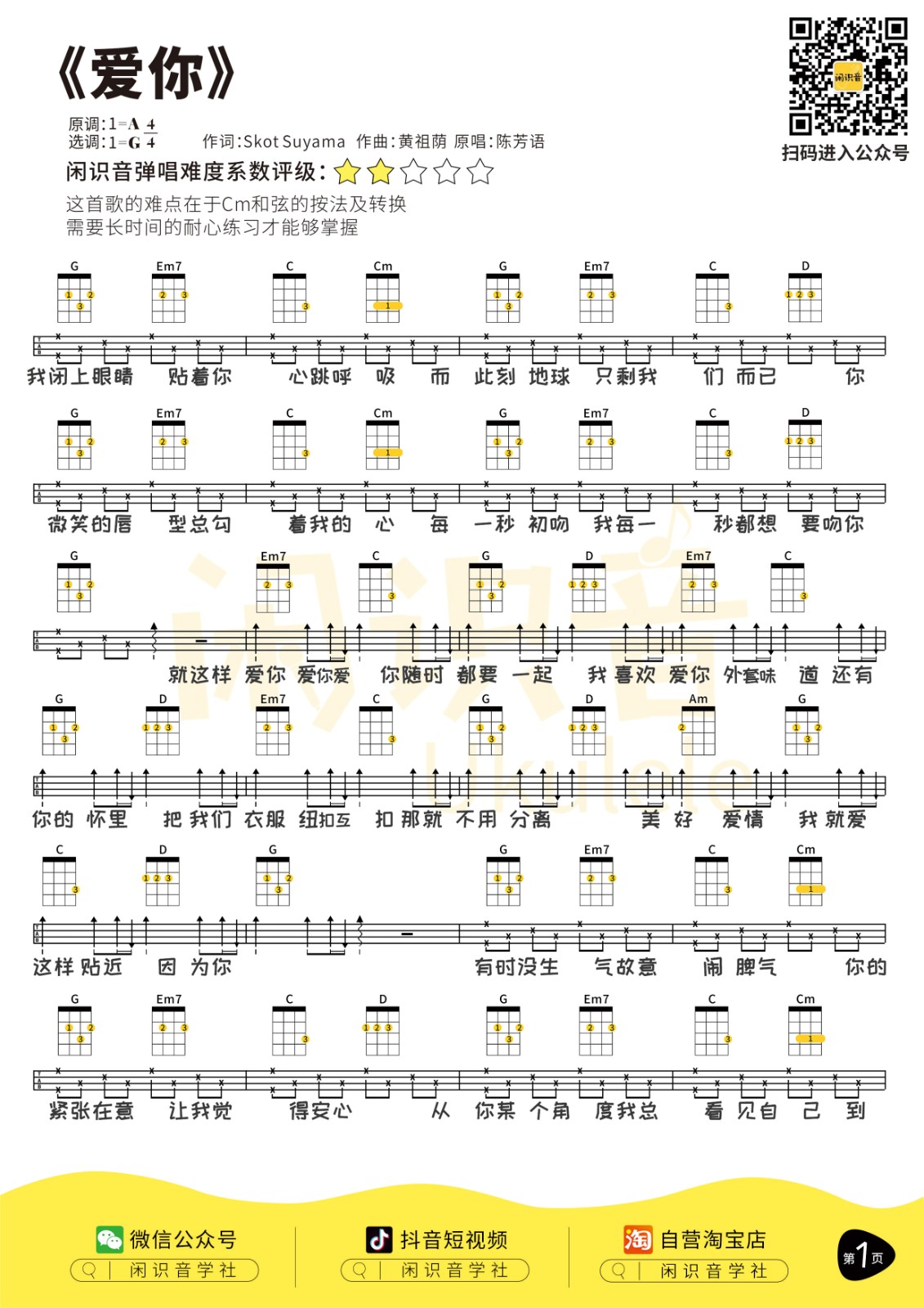 陈芳语《爱你》尤克里里曲谱-G调弹唱谱...