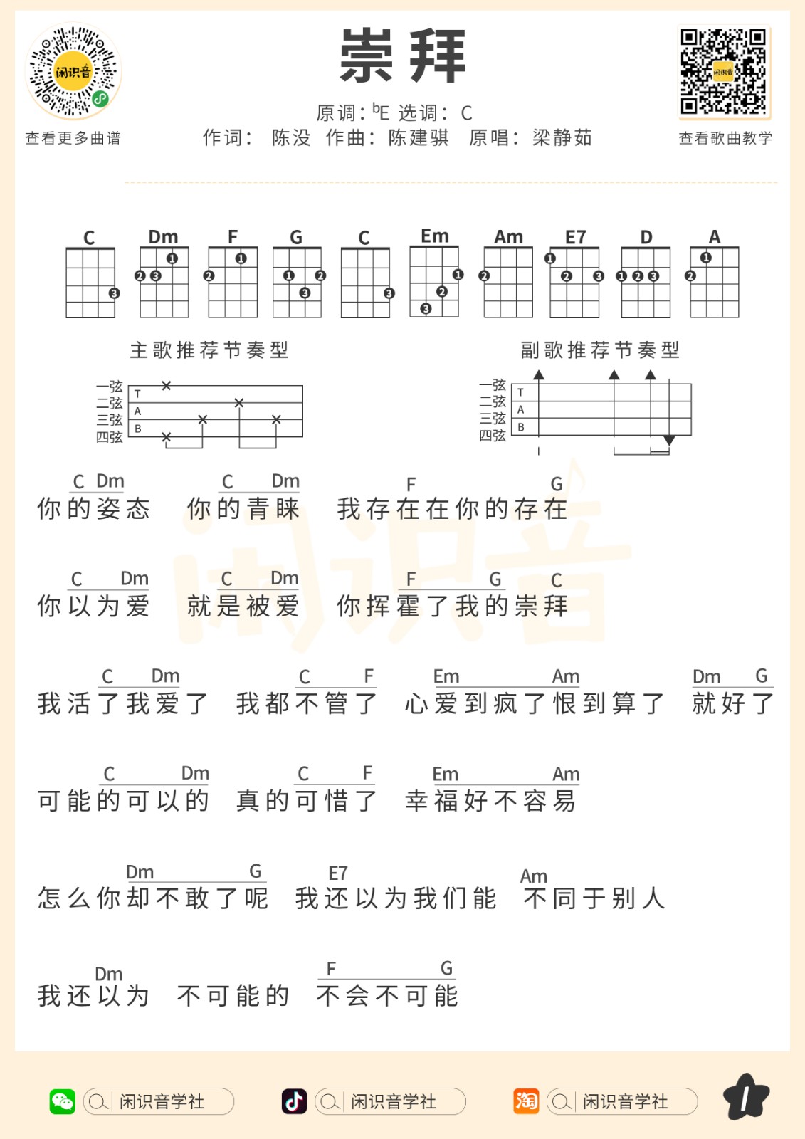 梁静茹《崇拜》尤克里里曲谱-C调弹唱谱...