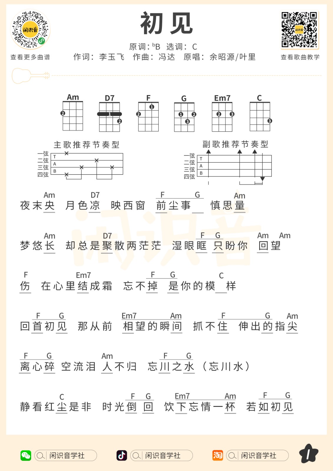 余昭源/叶里《初见》尤克里里曲谱-C调弹唱谱...