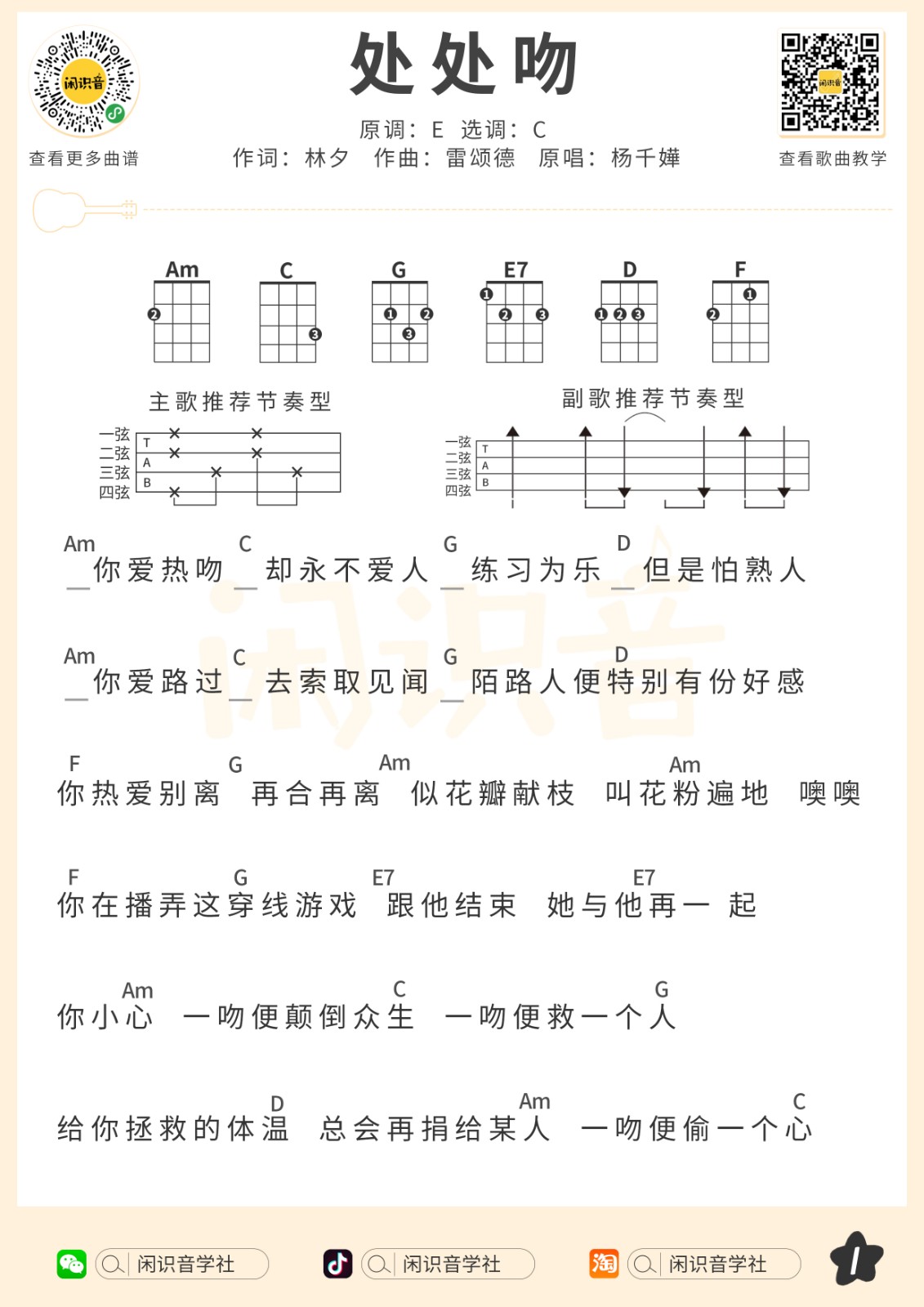 尤克里里杨千嬅《处处吻》尤克里里曲谱-C调弹唱谱
