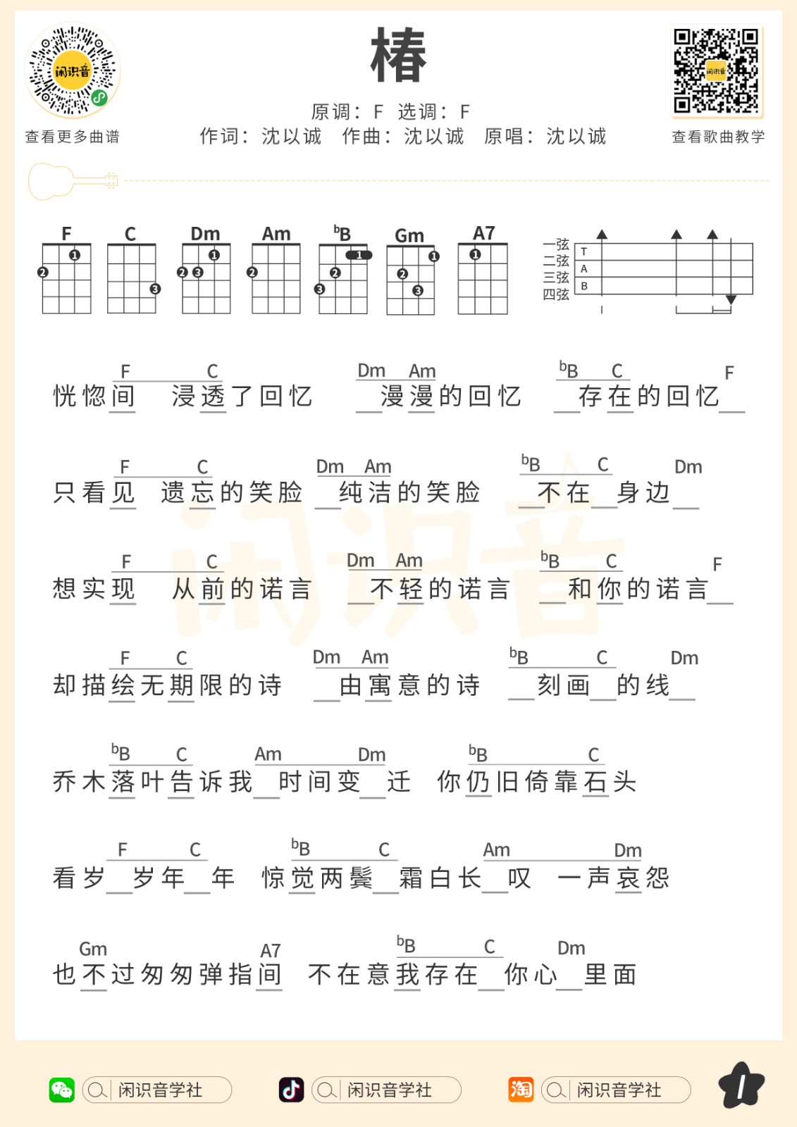 沈以诚《椿》尤克里里曲谱-F调弹唱谱...