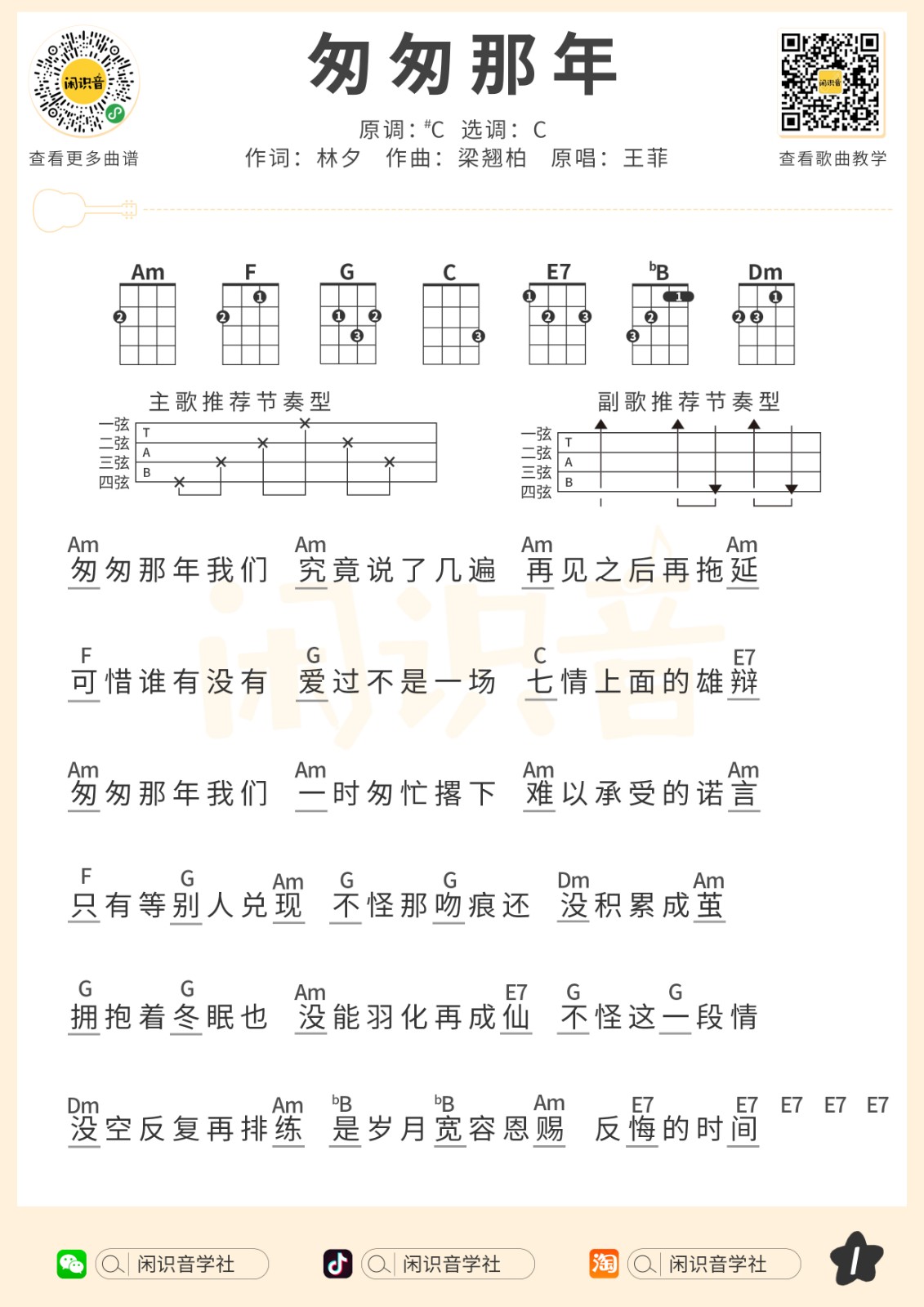 王菲《匆匆那年》尤克里里曲谱-C调弹唱谱...