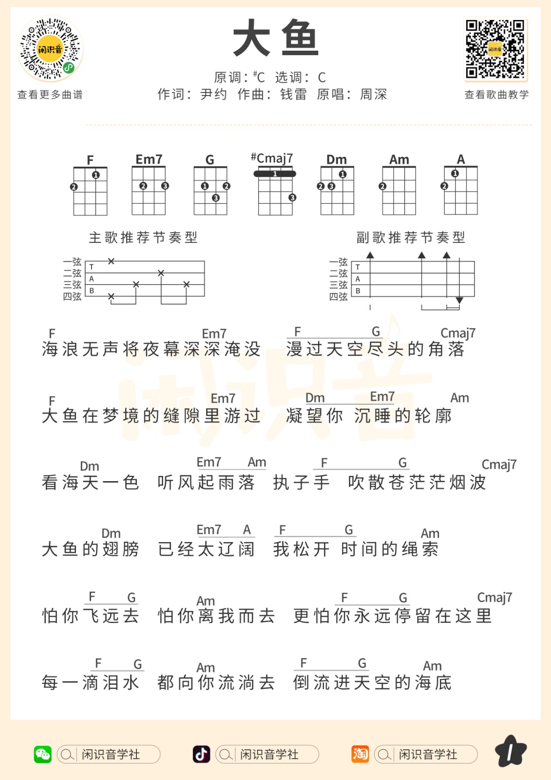周深《大鱼》尤克里里曲谱-C调弹唱谱...
