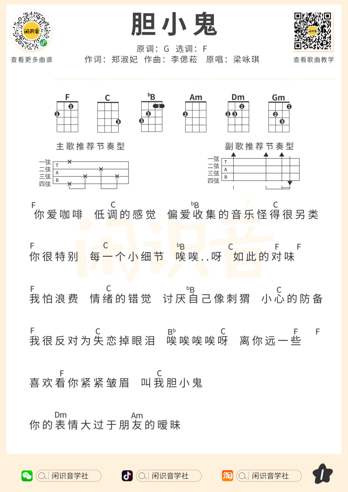 梁咏琪《胆小鬼》尤克里里曲谱-F调弹唱谱...