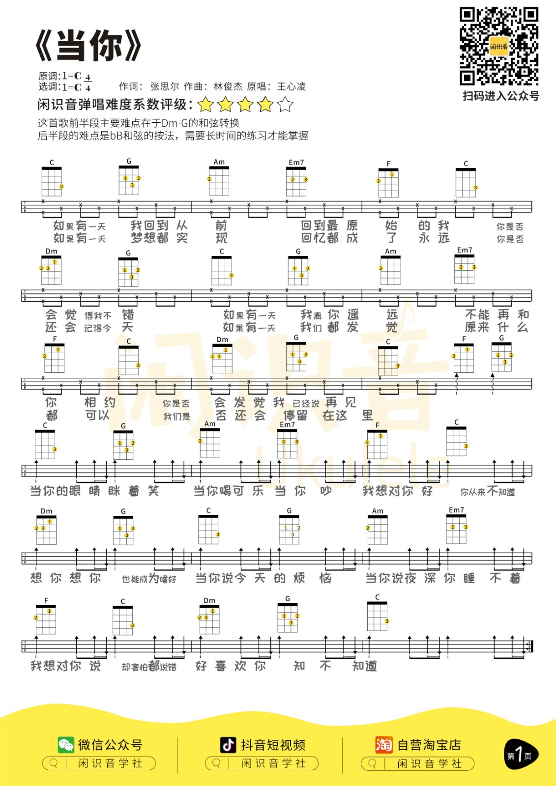 尤克里里王心凌《当你》尤克里里曲谱-C调弹唱谱