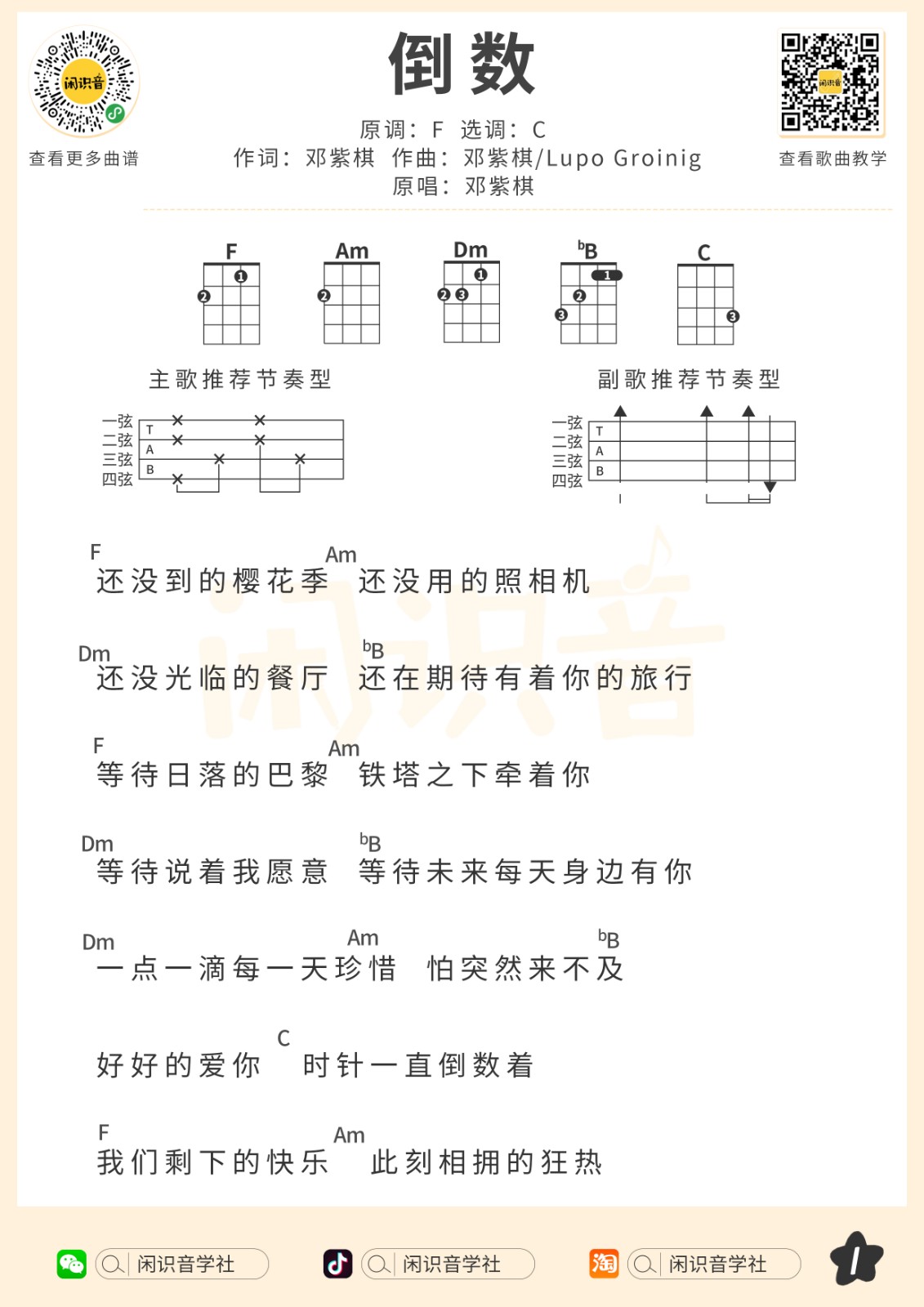 尤克里里邓紫棋《倒数》尤克里里曲谱-C调弹唱谱
