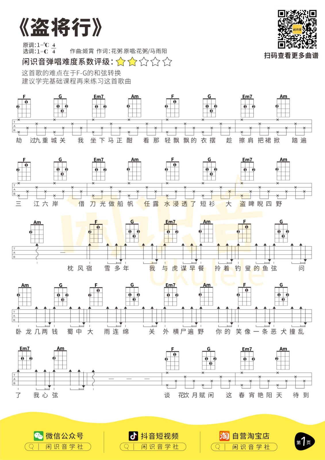 花粥《盗将行》尤克里里曲谱-C调弹唱谱...
