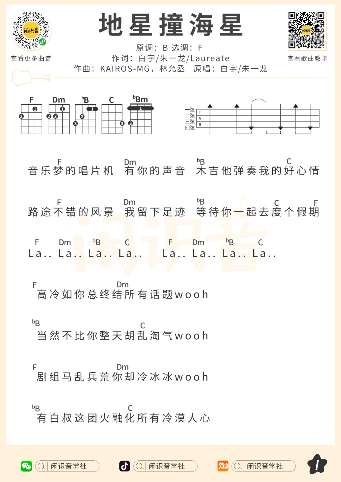 尤克里里白宇/朱一龙《地球撞海星》尤克里里曲谱-F调弹唱谱
