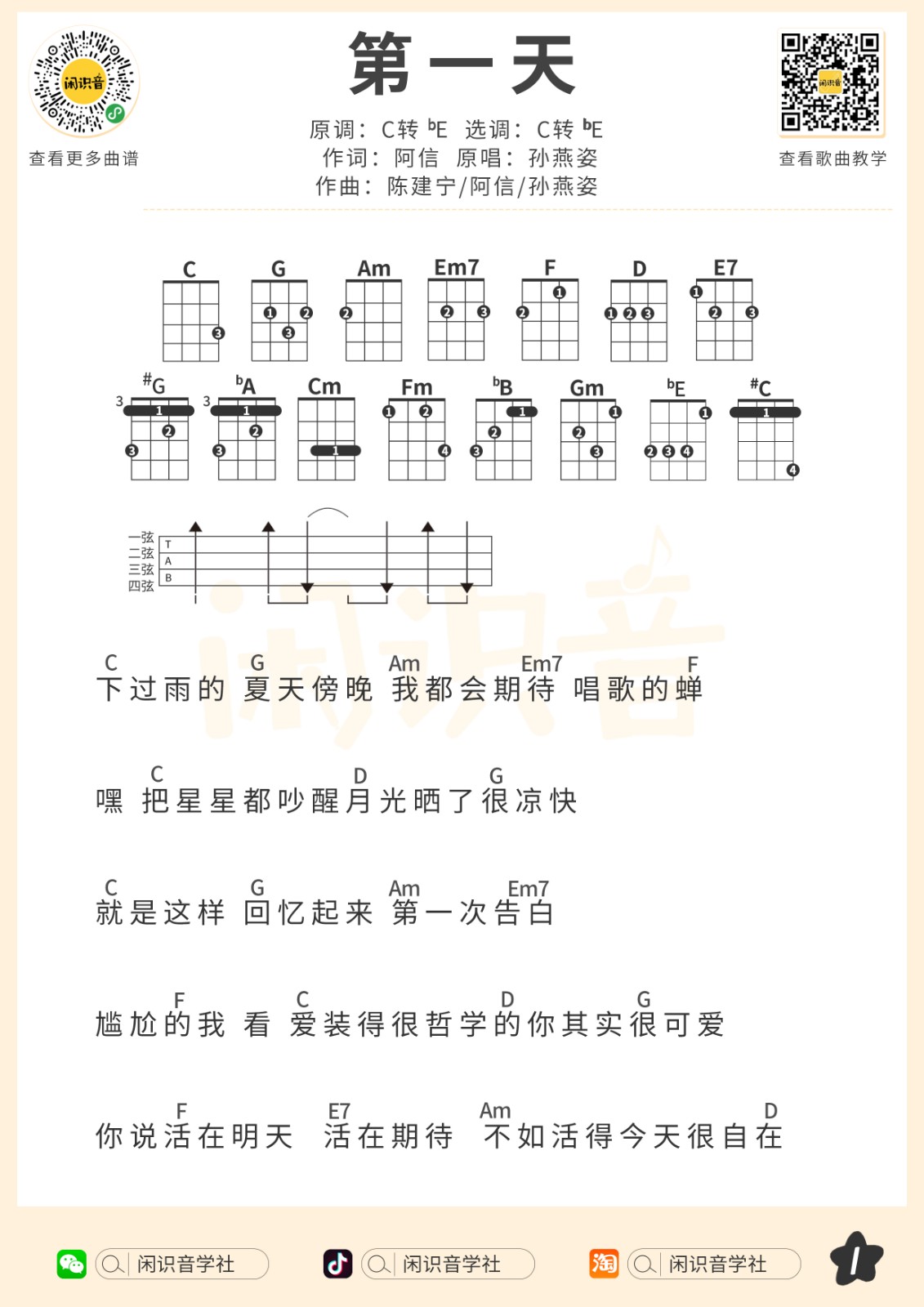 孙燕姿《第一天》尤克里里曲谱-bE调弹唱谱...