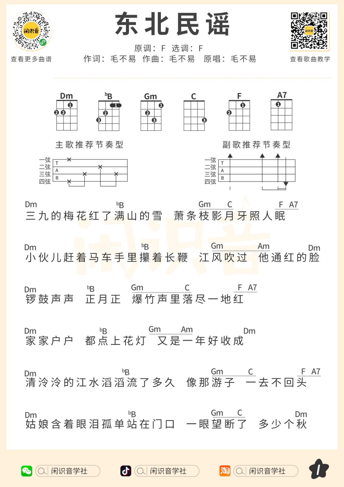 毛不易《东北民谣》尤克里里曲谱-F调弹唱谱...