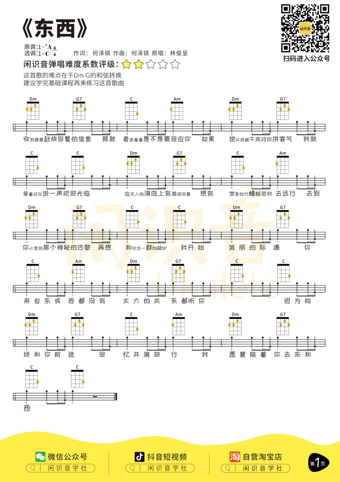 林俊呈《东西》尤克里里曲谱-C调弹唱谱...