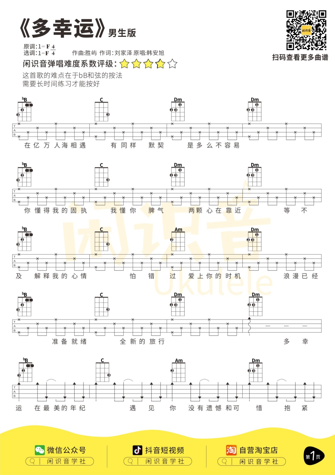 韩安旭《多幸运》男生版/女生版尤克里里曲谱-F调弹唱谱...