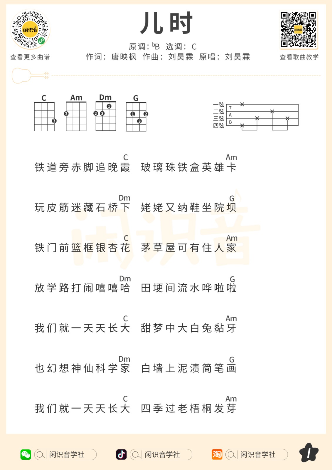 刘昊霖《儿时》尤克里里曲谱-C调弹唱谱...
