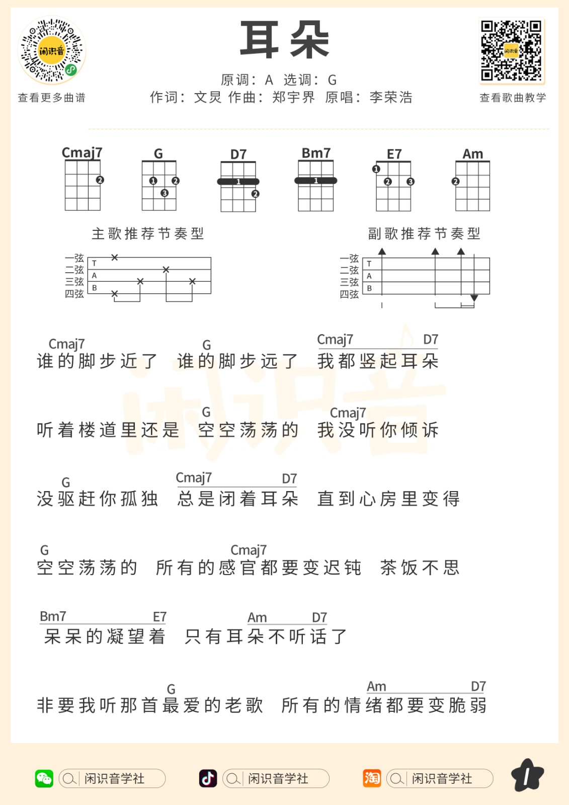 尤克里里李荣浩《耳朵》尤克里里曲谱-G调弹唱谱