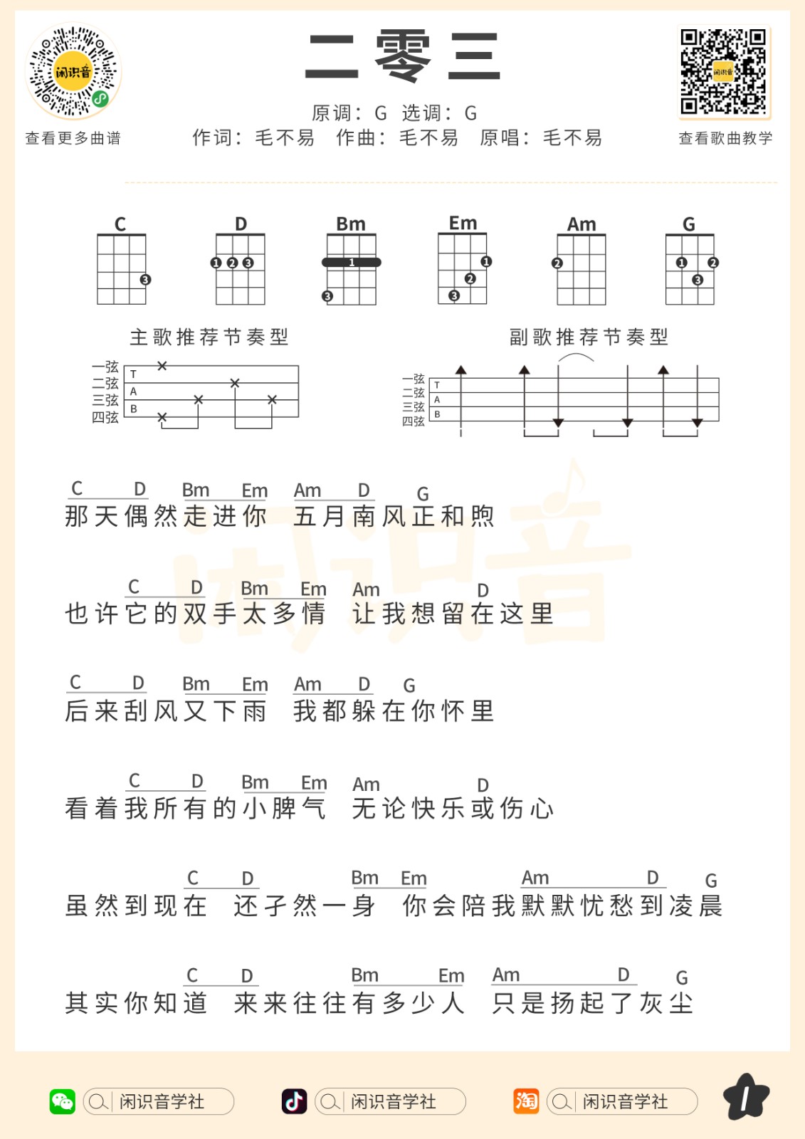 毛不易《二零三》尤克里里曲谱-G调弹唱谱...
