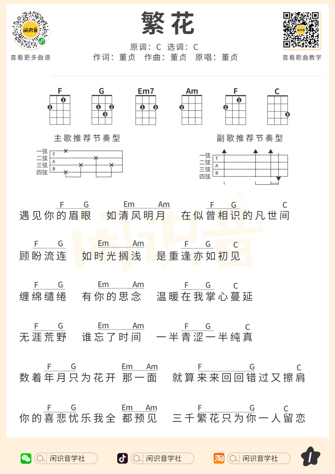 董贞《繁花》尤克里里曲谱-C调弹唱谱...