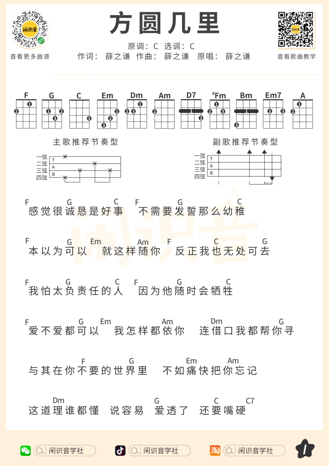 薛之谦《方圆几里》尤克里里曲谱-C调弹唱谱...