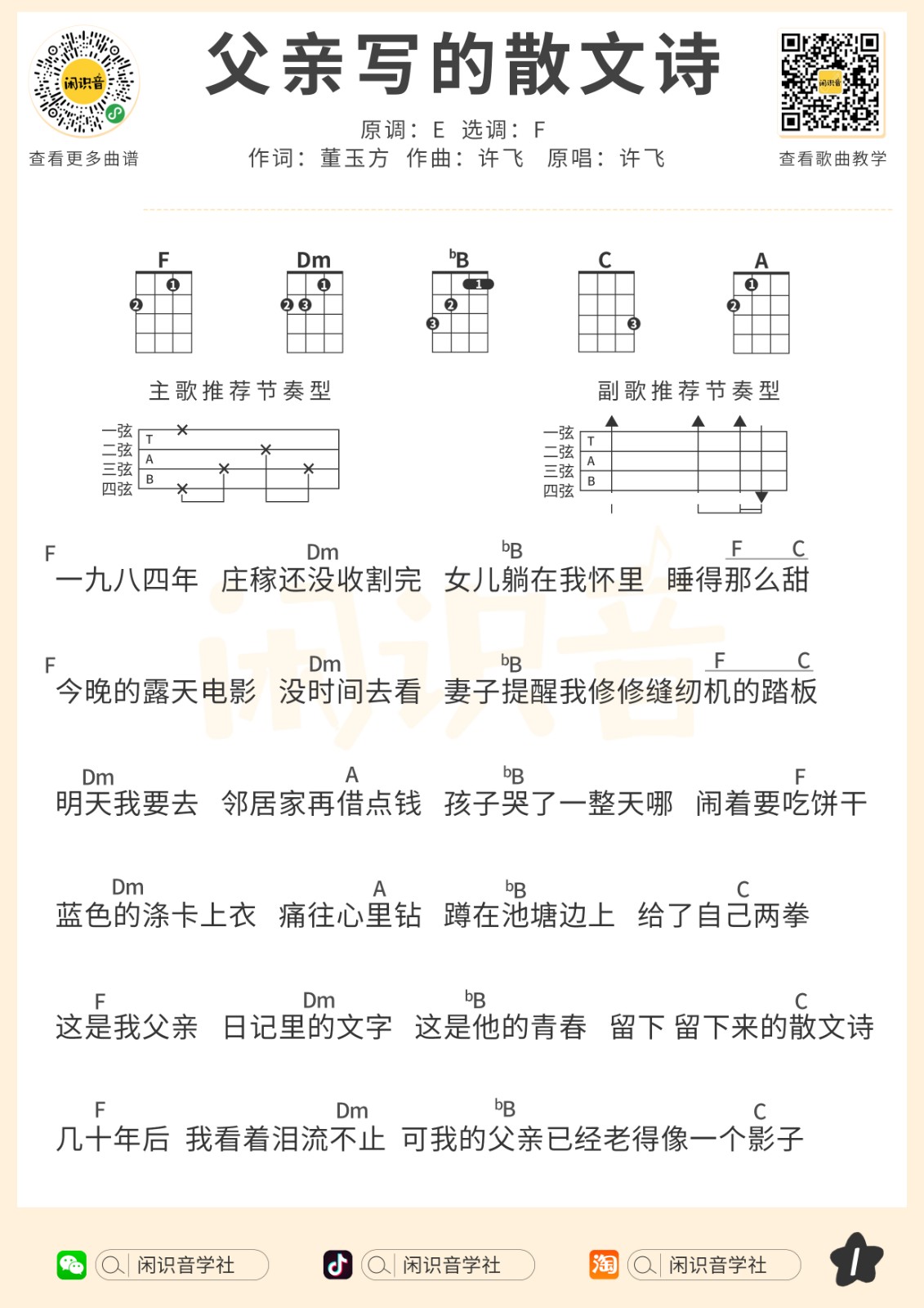许飞《父亲写的散文诗》尤克里里曲谱-F调弹唱谱...