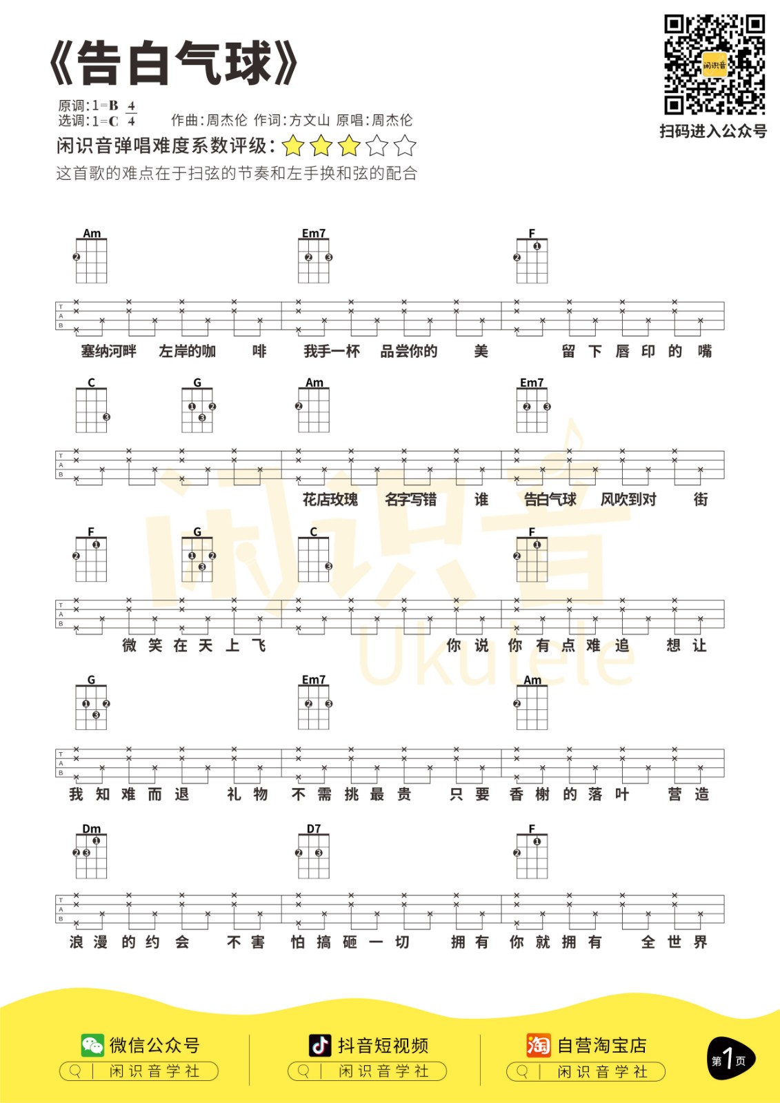 周杰伦《告白气球》尤克里里曲谱-C调弹唱谱...