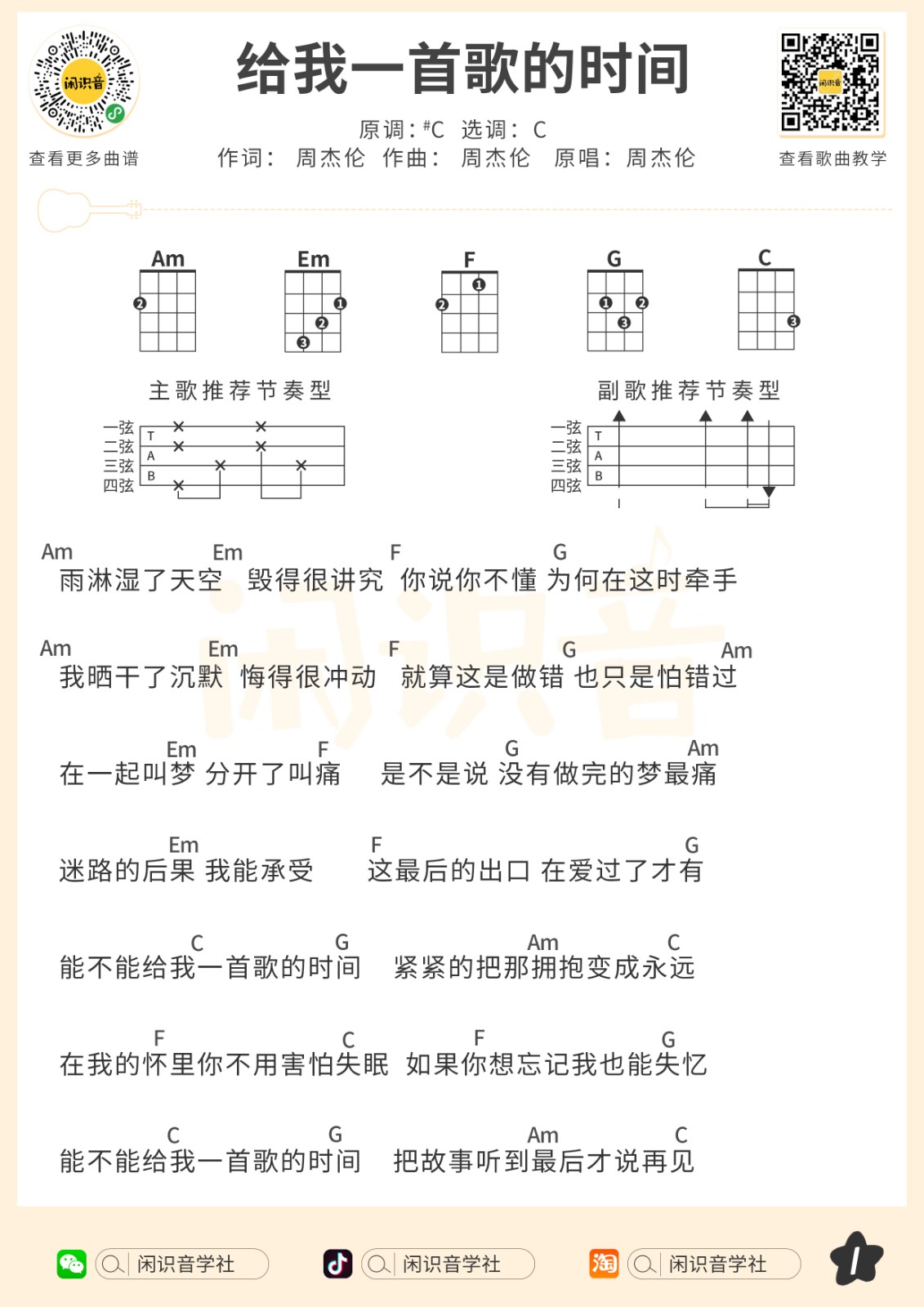 尤克里里周杰伦《给我一首歌的时间》尤克里里曲谱-C调弹唱谱