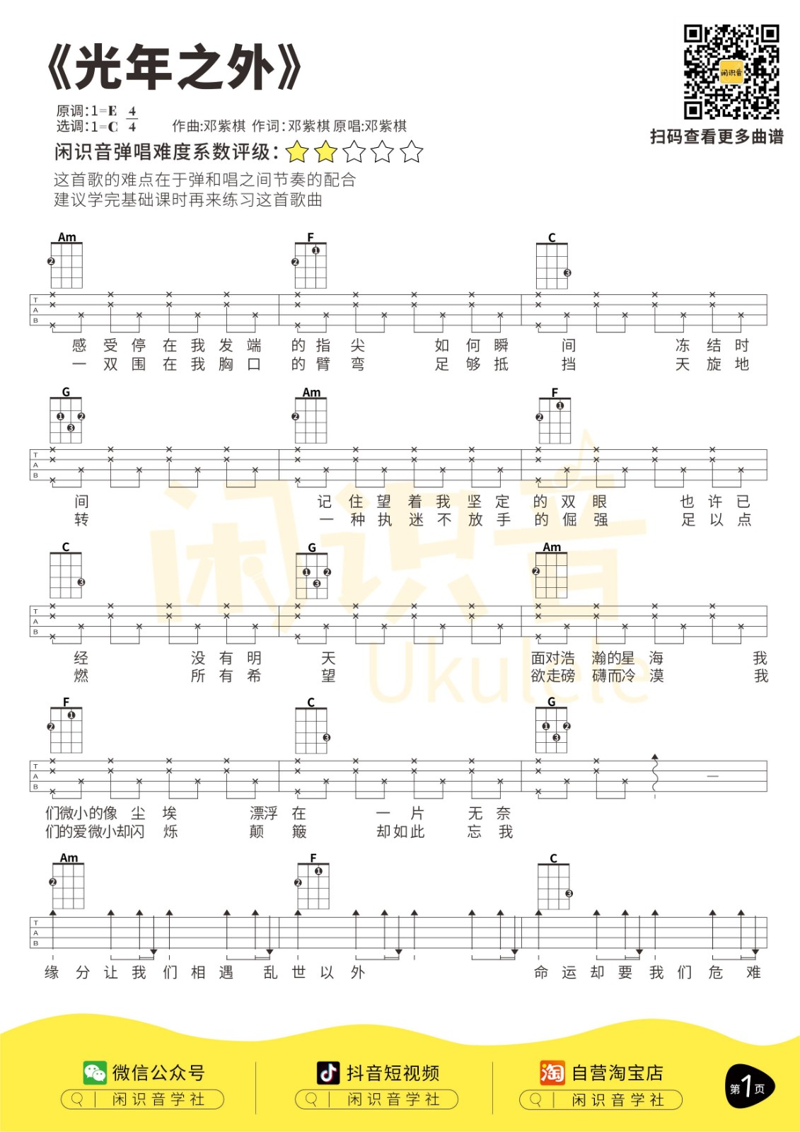 邓紫棋《光年之外》尤克里里曲谱-C调弹唱谱...