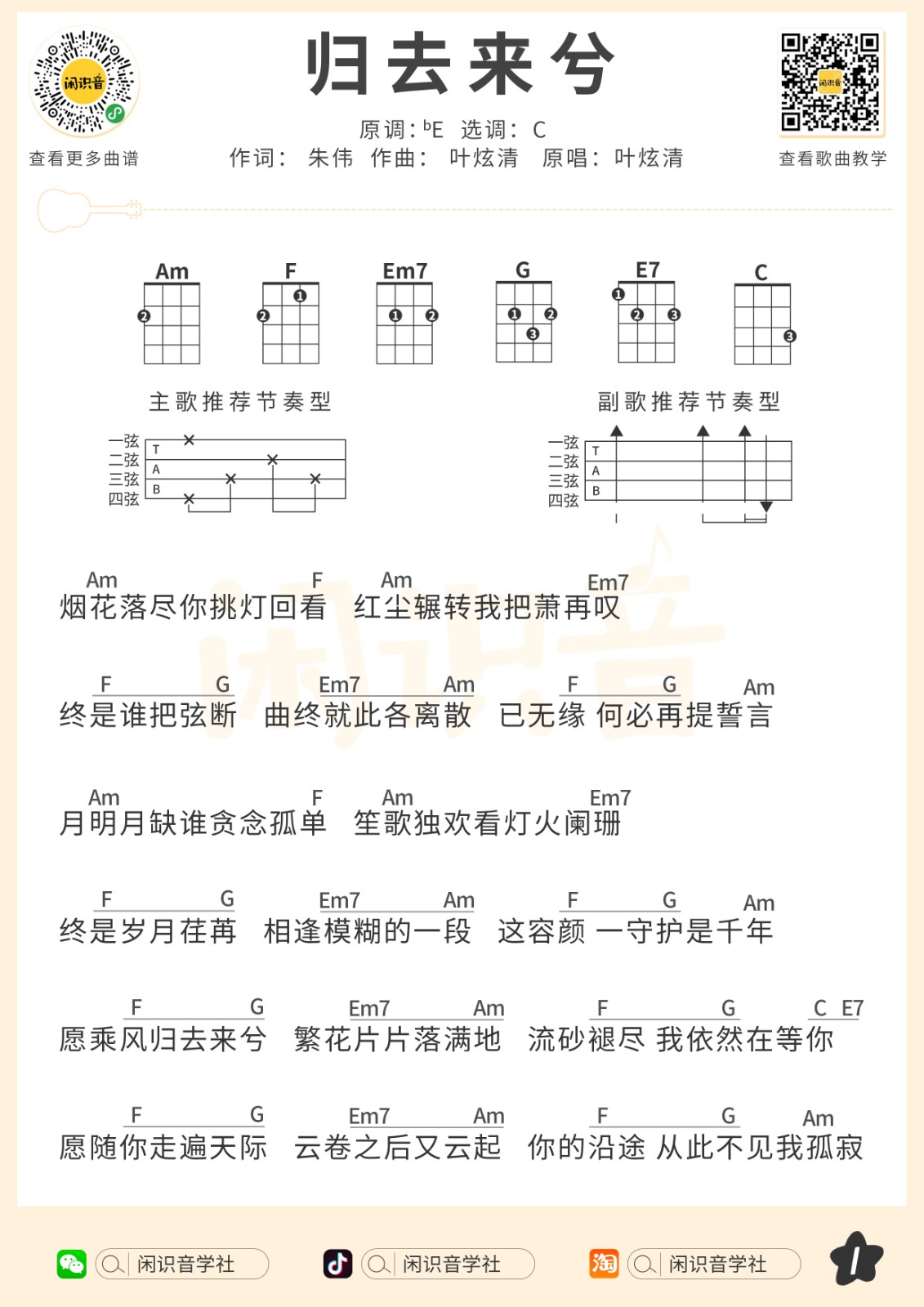 叶炫清《归去来兮》尤克里里曲谱-C调弹唱谱...