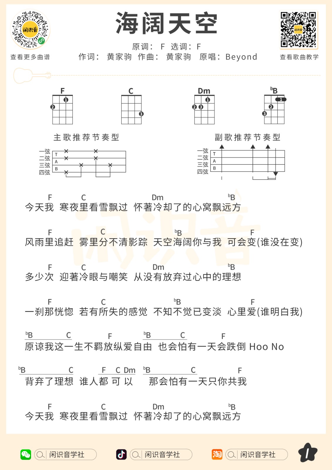 Beyond《海阔天空》尤克里里曲谱-F调弹唱谱...