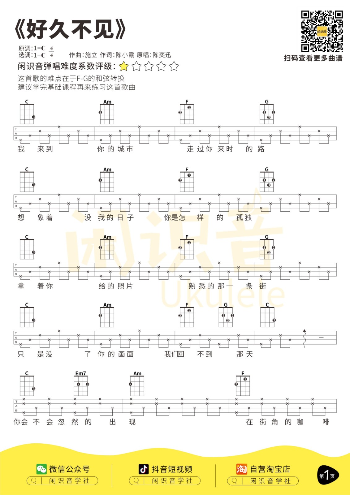 陈奕迅《好久不见》陈奕迅版尤克里里曲谱-C调弹唱谱...