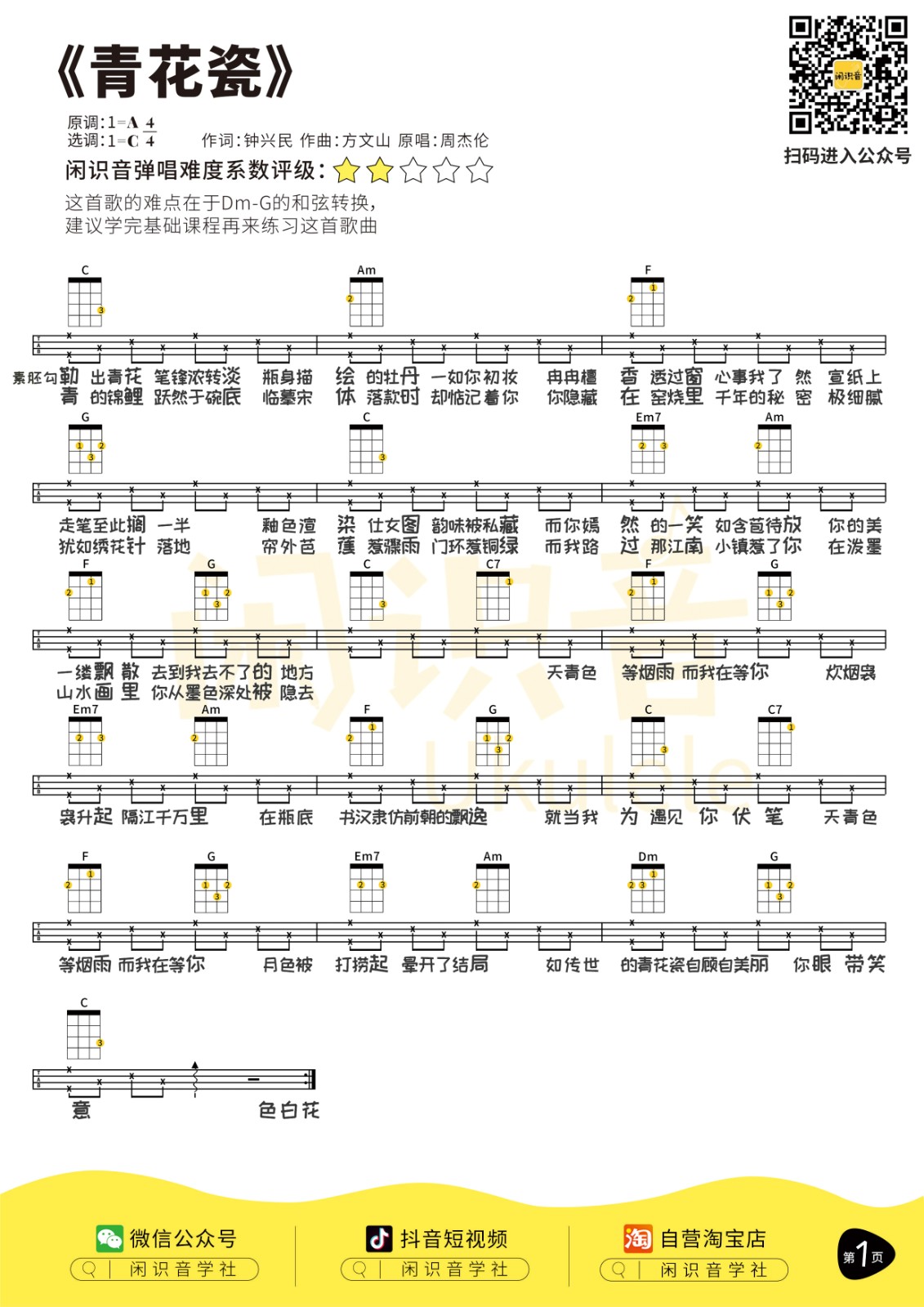 周杰伦《青花瓷》尤克里里曲谱-C调弹唱谱...
