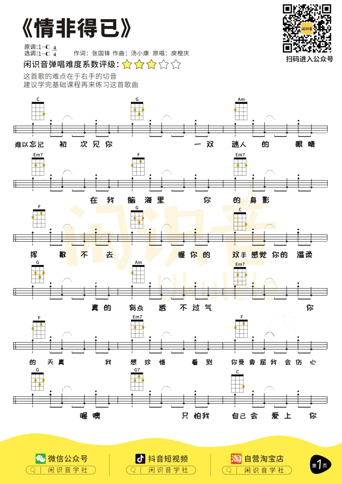 庾澄庆《情非得已》尤克里里曲谱-C调弹唱谱...
