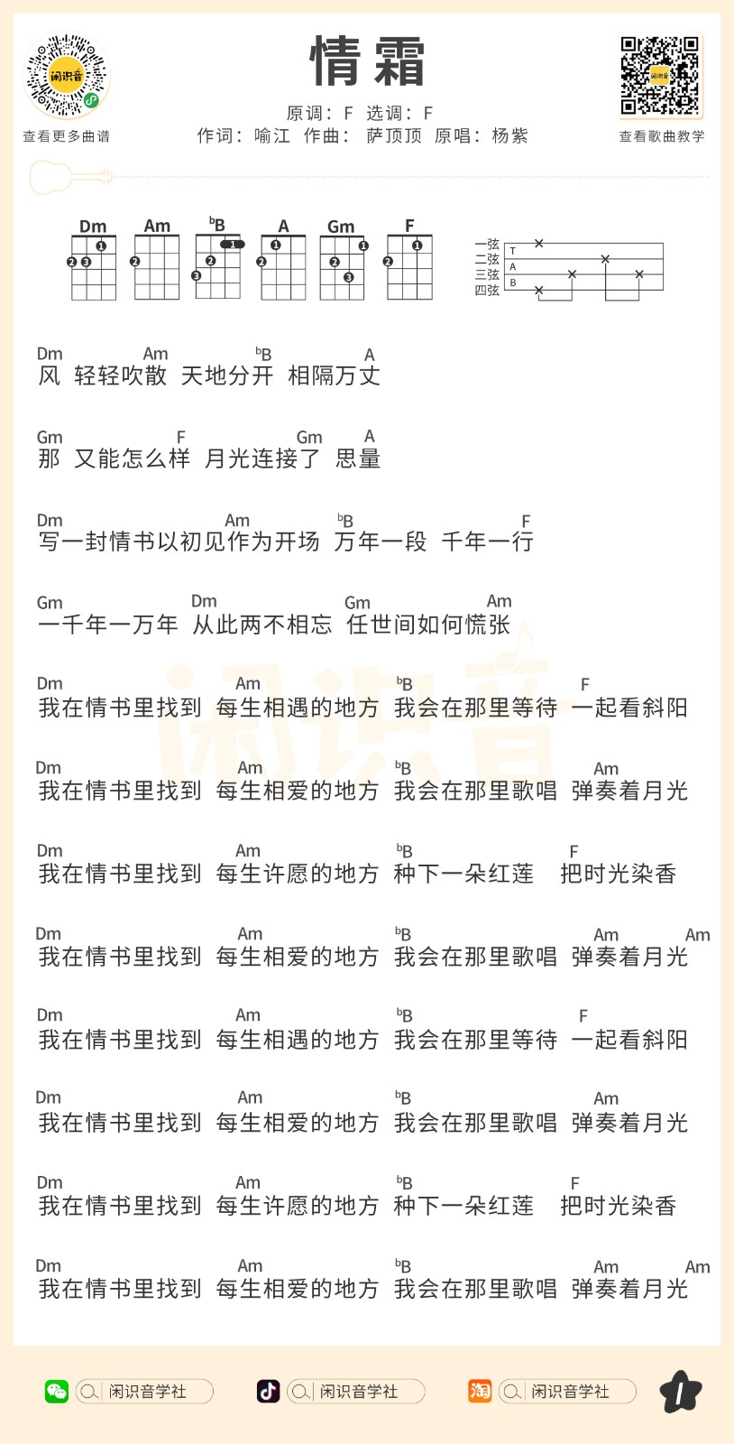 尤克里里杨紫《情霜》尤克里里曲谱-F调弹唱谱