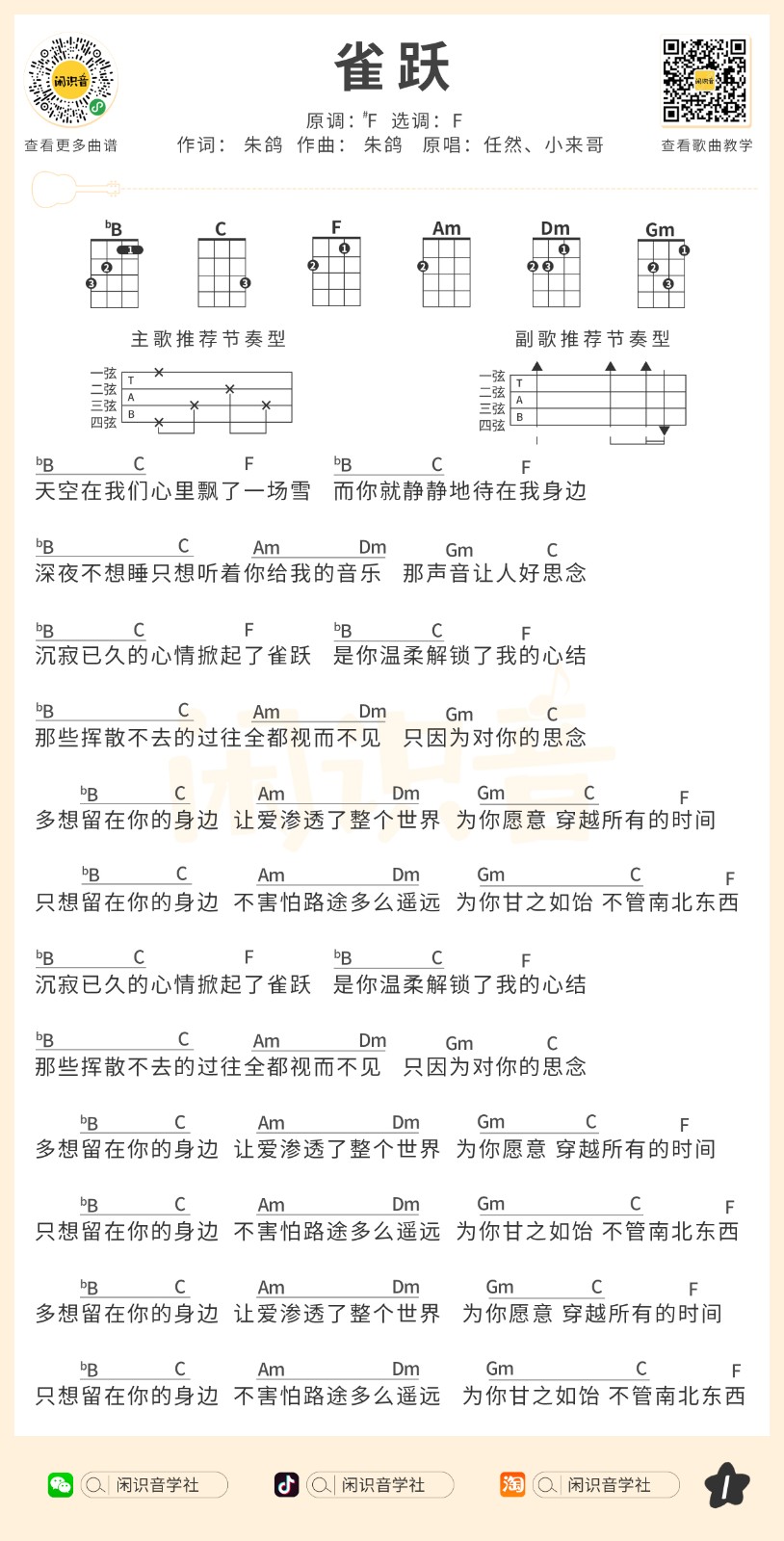 尤克里里任然/小栾哥《雀跃》尤克里里曲谱-F调弹唱谱