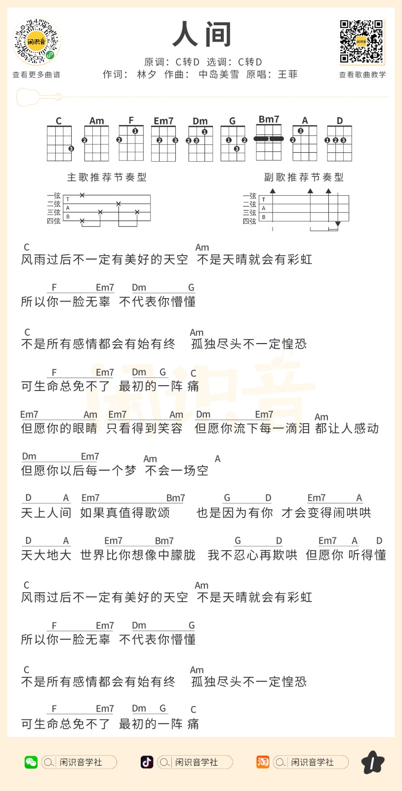 王菲《人间》尤克里里曲谱-D调弹唱谱...