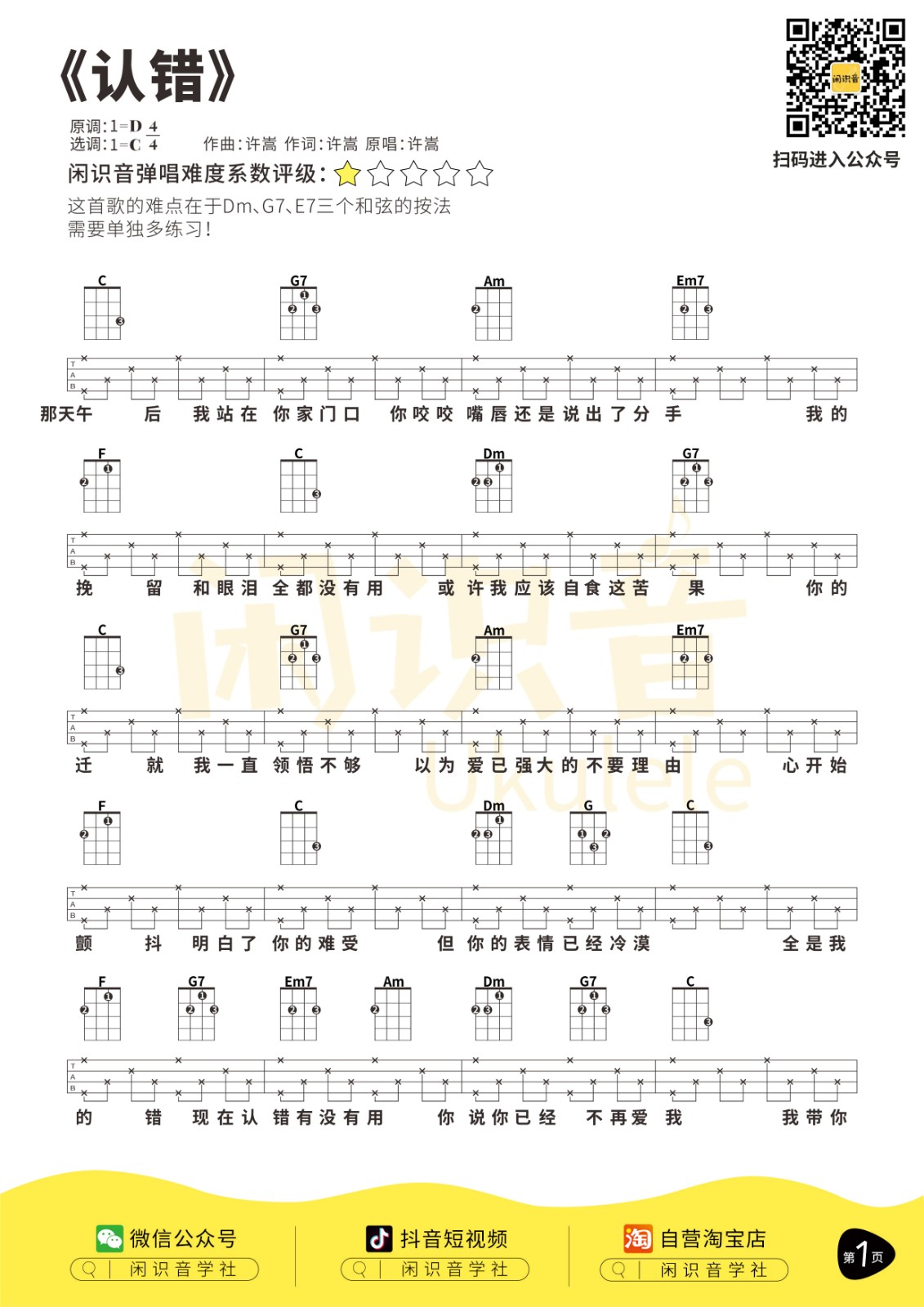 尤克里里许嵩《认错》尤克里里曲谱-C调弹唱谱