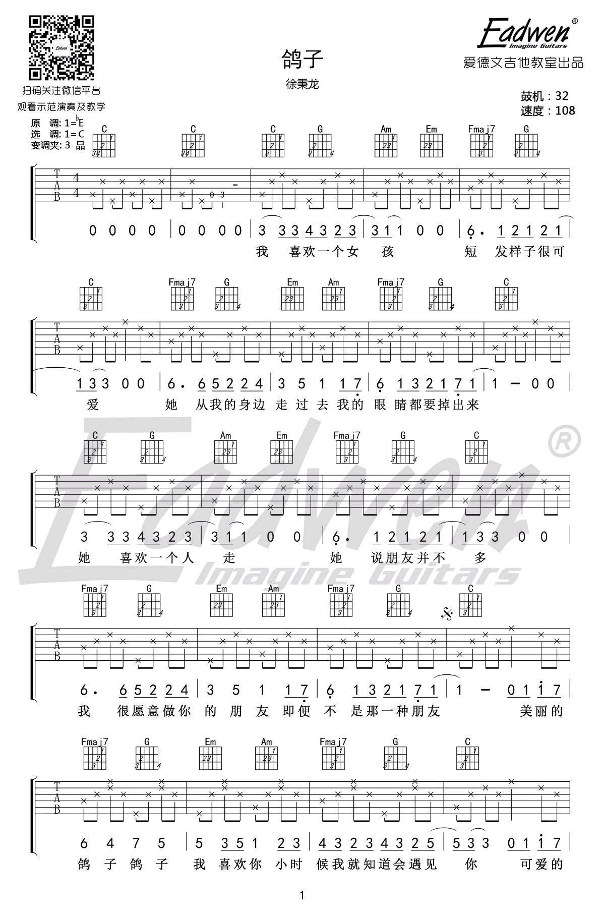 吉他徐秉龙《鸽子》吉他谱_吉他弹唱谱_爱德文吉他编配