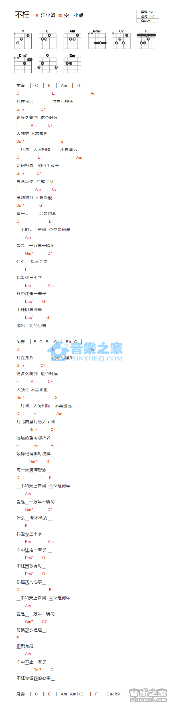 C调版汪小敏《不枉》吉他和弦弹唱谱...