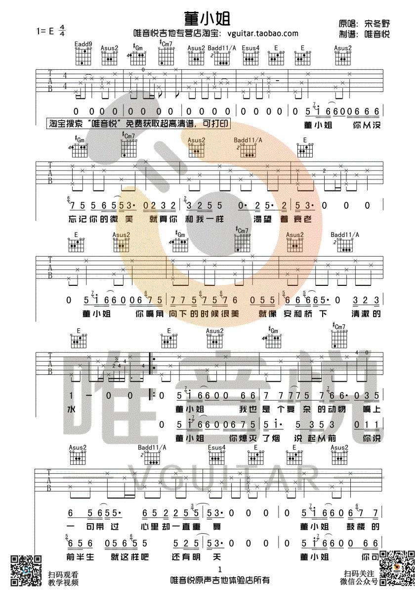 吉他宋冬野《董小姐》吉他谱_吉他弹唱谱_唯音悦编配