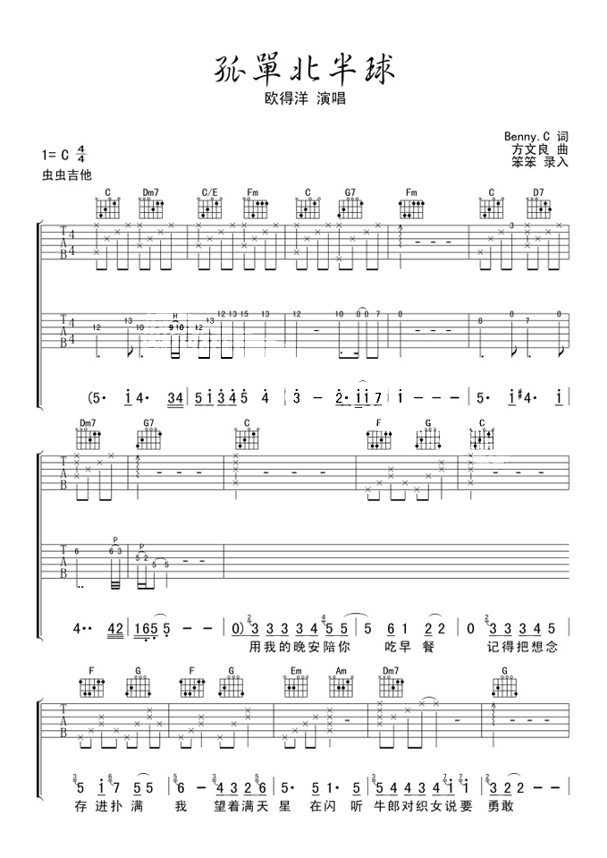 欧得洋《孤单北半球》吉他谱_C调吉他弹唱谱...